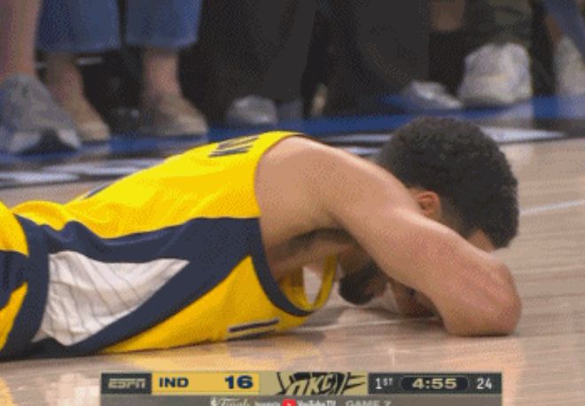 步行者主帅卡莱尔请求暂停,哈利伯顿随后被搀扶离场,他的右脚几乎无法触地。哈利伯顿的伤情需要等待进一步的检查,但他的如此表现很类似2019年总决赛,杜兰特强行复出跟腱断裂赛季报销的情况。
